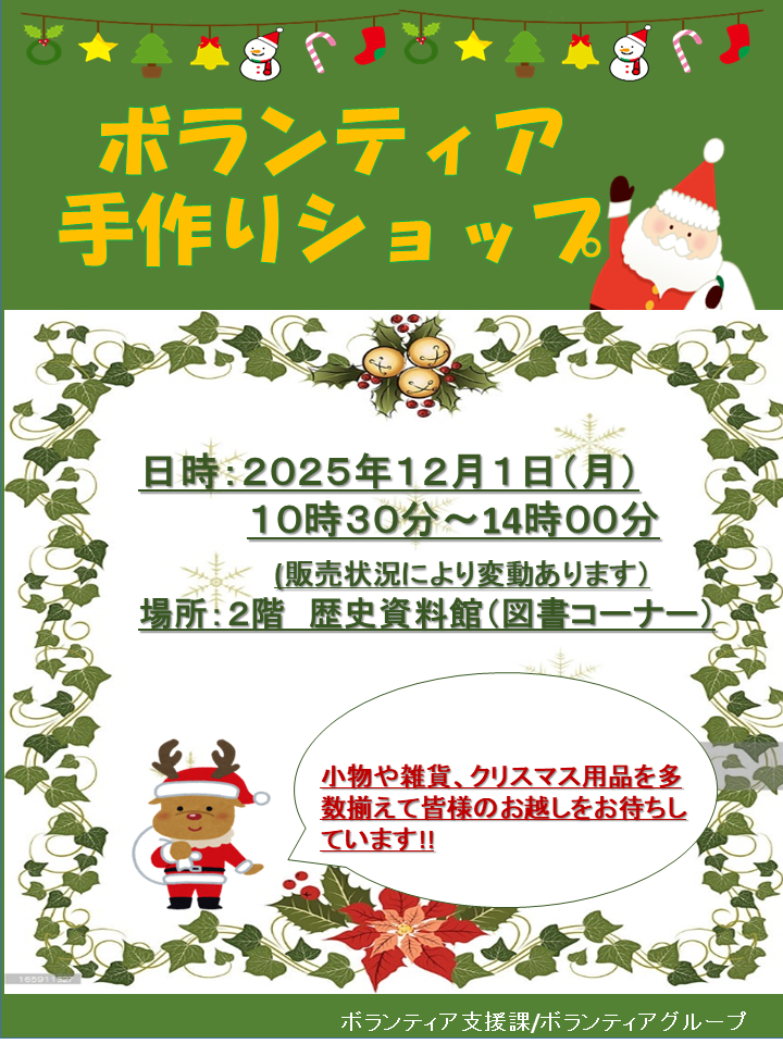 2025年11月19日講座・イベント NEW 12月1日(月) ボランティア手作りショップ 開催のお知らせ ボランティア 手作りショップ 開催日 : 2025年12月1日(月)時 間 : 10:30 ~ 14:00(販売状況により変動あります)場 所 : 淀川キリスト教病院 2階 歴史資料館(図書コーナー) 主催:ボランティア支援課/ボランティアグループ 一覧へ戻る