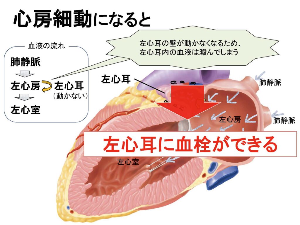 心房細動になると、二つの問題が生じます。一つは脈拍が不規則になるということ、もう一つは血栓症のリスクが生じるということです。