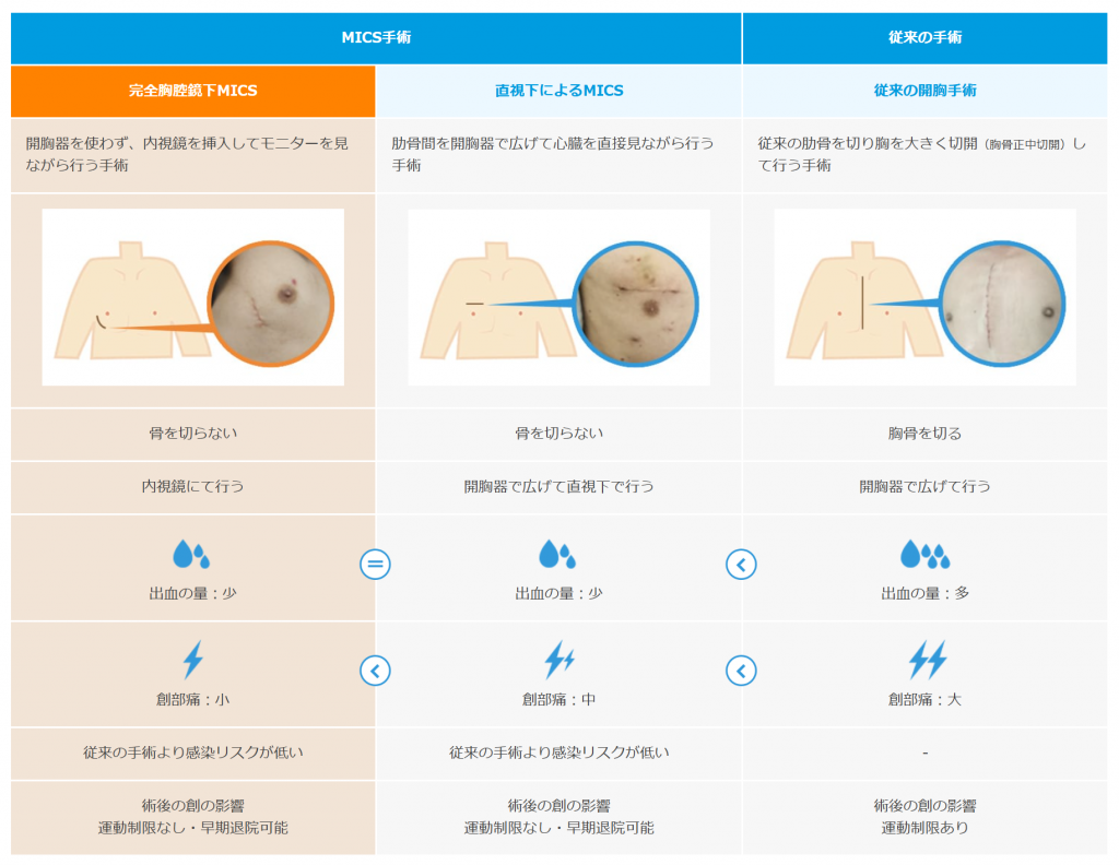 MICS(ミックス)は、胸の正面にある胸骨を大きく切開せず、小さな切開創から内視鏡(胸腔鏡)を使って行う心臓手術です。従来の胸骨正中切開で行う手術に比べ、以下のような特徴があります。